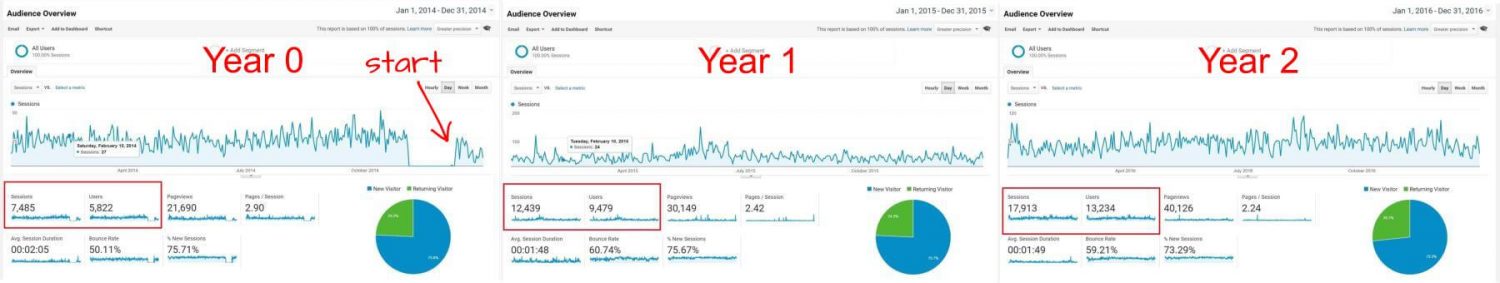 Using the numbers from Year 0 as a baseline (we started our SEO at the end of that year) by the end of Year 1 we’d increased the number of visits (“sessions”) by 4,954 (+66%) and the number of visitors (“users”) by 3,329 (+62.8%).