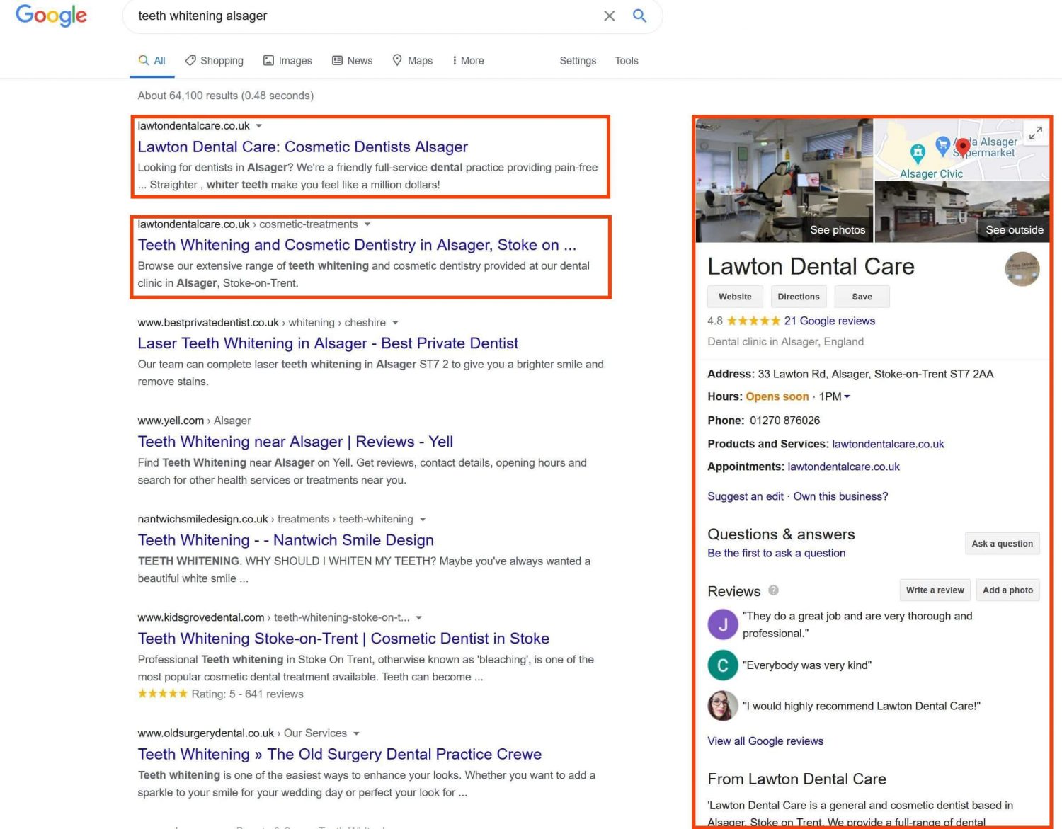 Here’s a screenshot from 10th July 2020 showing multiple page 1 rankings for cosmetic dentists Alsager: